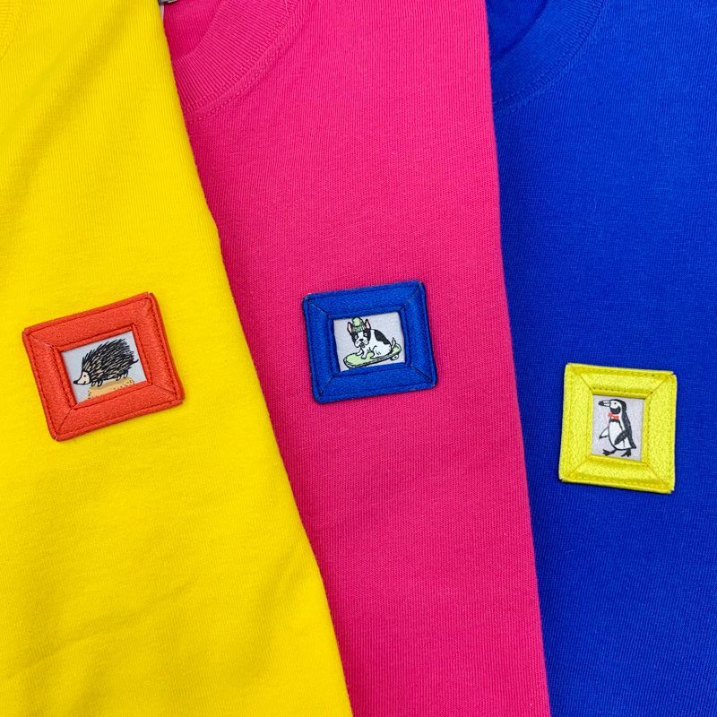 カラフルなTシャツにユニークアニマルが描かれた小さなアートフレームを左胸にワンポイント